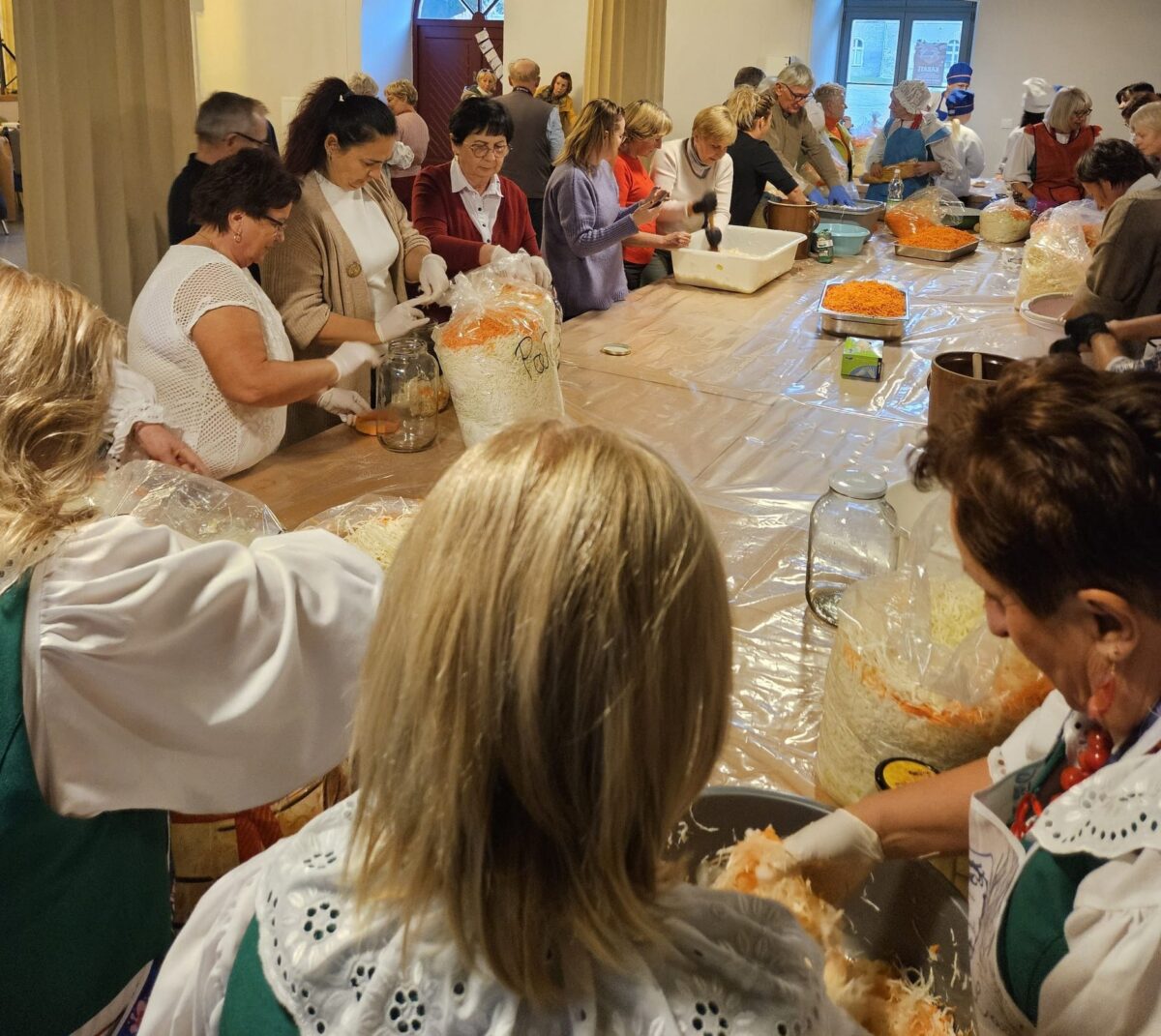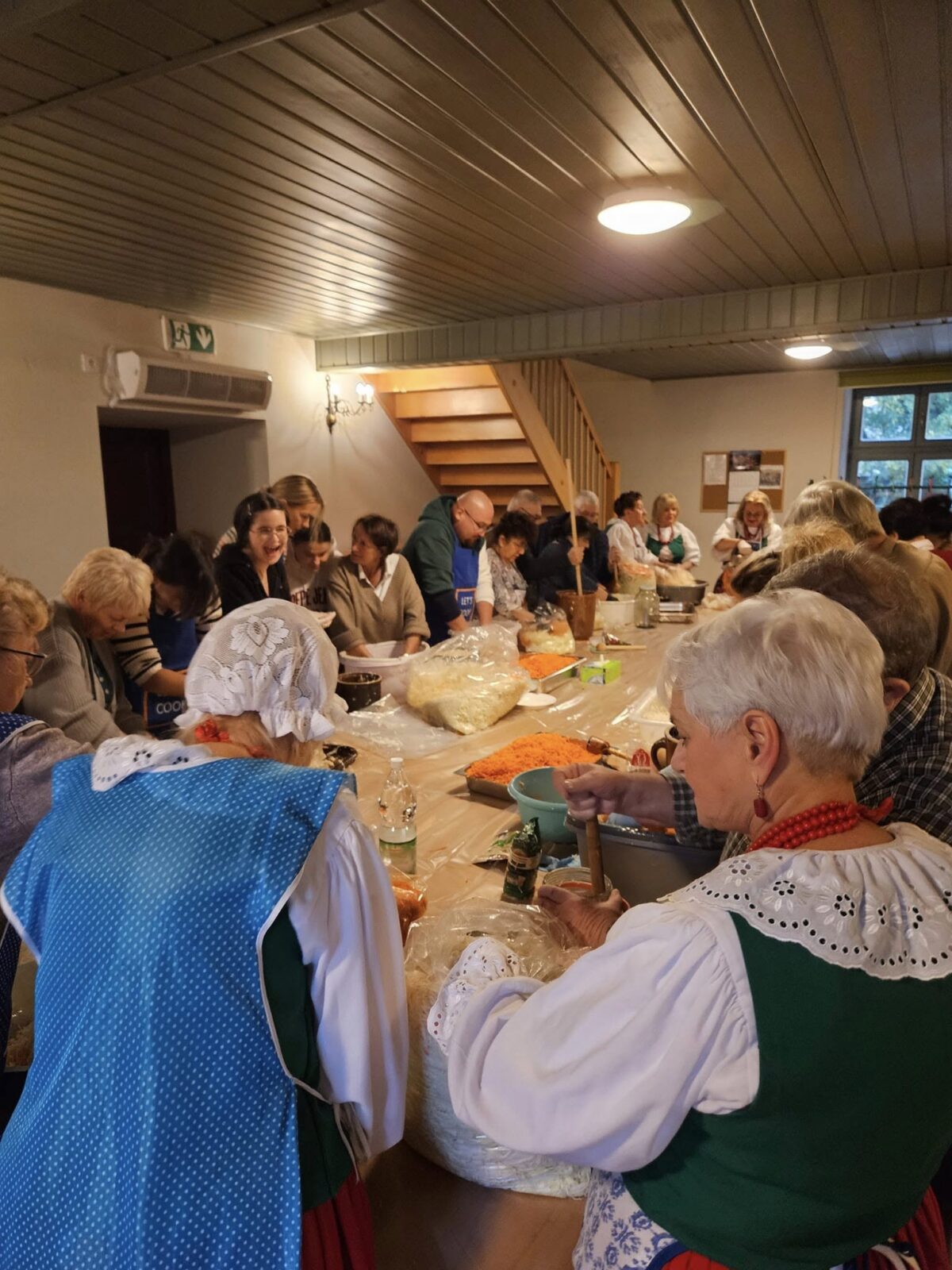 Uczestnicy wysłuchali występu zespołu, po czym wspólnie przystąpili do kiszenia kapusty, poznając tradycyjne metody jej przygotowania. Podczas warsztatów omawiano kolejne etapy procesu, od przygotowania kapusty i przypraw, aż po technikę ugniatania i zasalania. Dzięki kameralnej formule wydarzenia możliwa była swobodna rozmowa, wymiana doświadczeń oraz wspólna praca nad przygotowaniem jesiennego przysmaku.