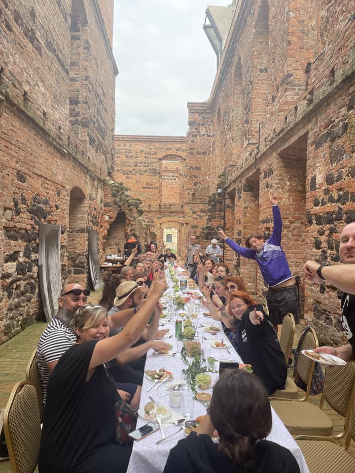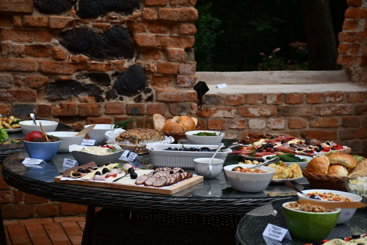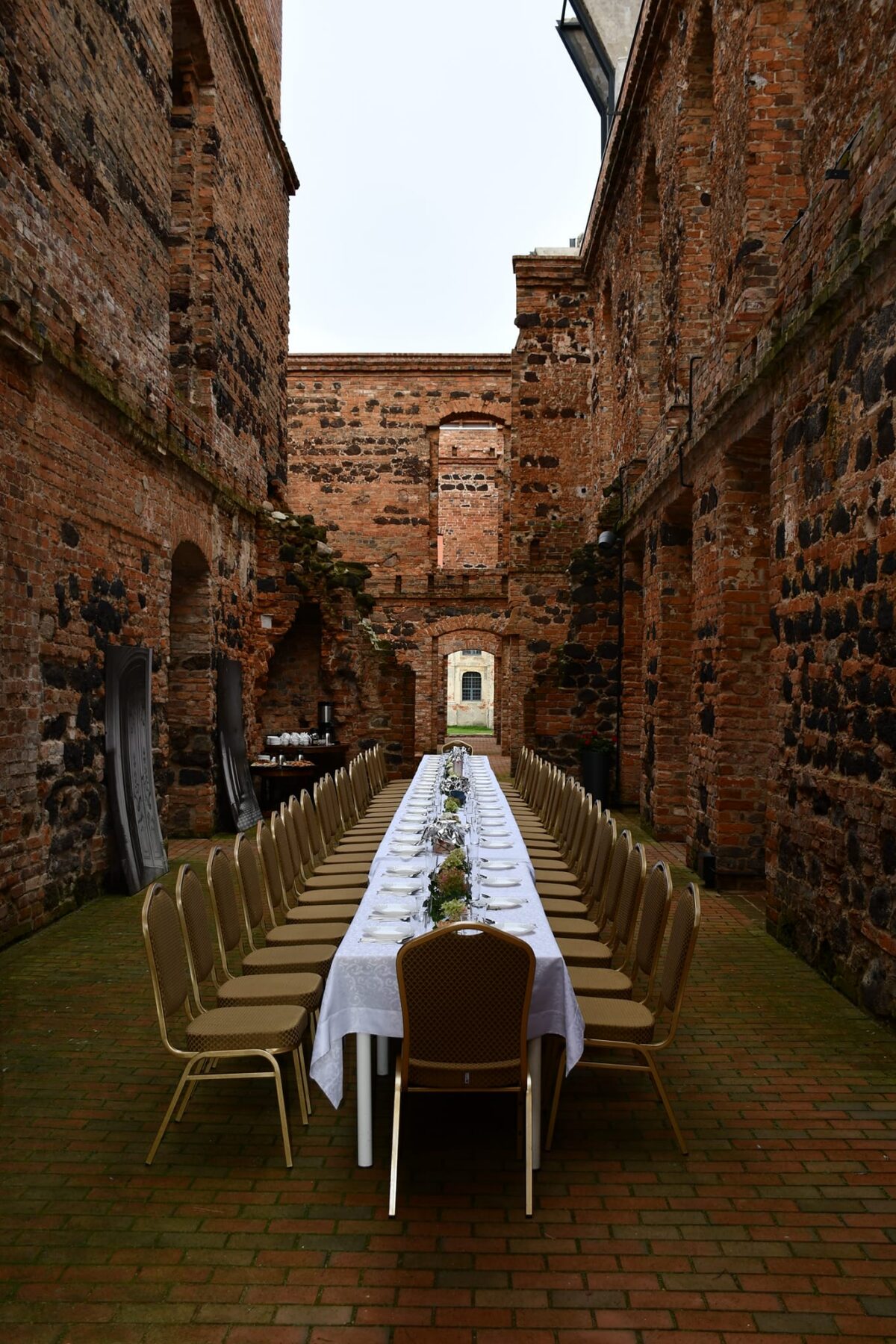 Surowe, ceglane mury otaczające przestrzeń dodały spotkaniu niezwykłego charakteru, podkreślając piękno zabytku i wyjątkowość chwili. W takim otoczeniu każdy detal – od nakryć stołowych po dekoracje – nabierał szczególnego znaczenia.