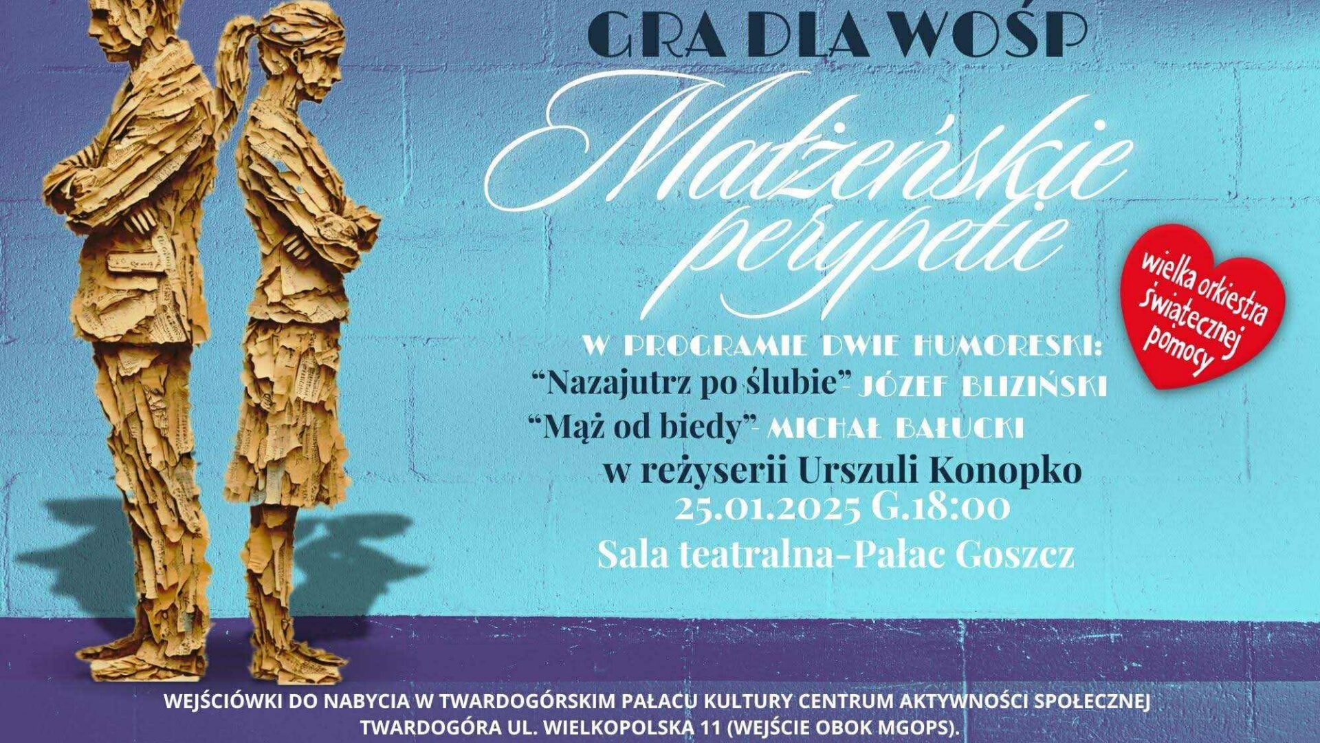 25 stycznia 2025 roku w Sali Teatralnej Pałacu Goszcz odbył się wyjątkowy spektakl teatralny „Małżeńskie perypetie” w ramach 33. Finału Wielkiej Orkiestry Świątecznej Pomocy w Gminie Twardogóra. Wydarzenie połączyło sztukę sceniczną z charytatywną inicjatywą, umożliwiając mieszkańcom aktywny udział w zbiórce na cele WOŚP.