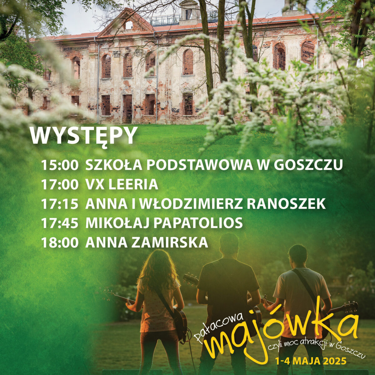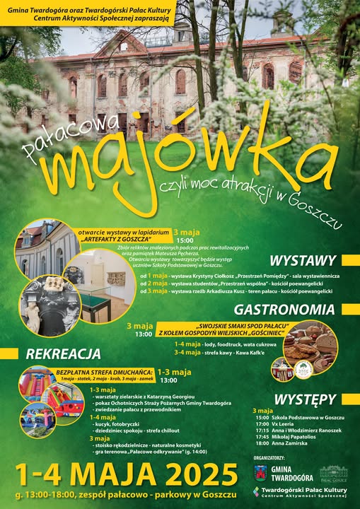 W długi weekend majowy Pałac Goszcz zaprosił odwiedzających na Pałacową Majówkę, pełną warsztatów, wystaw, pokazów i koncertów, przygotowaną zarówno dla dzieci, jak i dorosłych. Wydarzenie odbyło się w dniach 1–4 maja 2025 roku i przyciągnęło liczne grono gości, którzy mogli aktywnie spędzić czas w pięknym otoczeniu pałacu