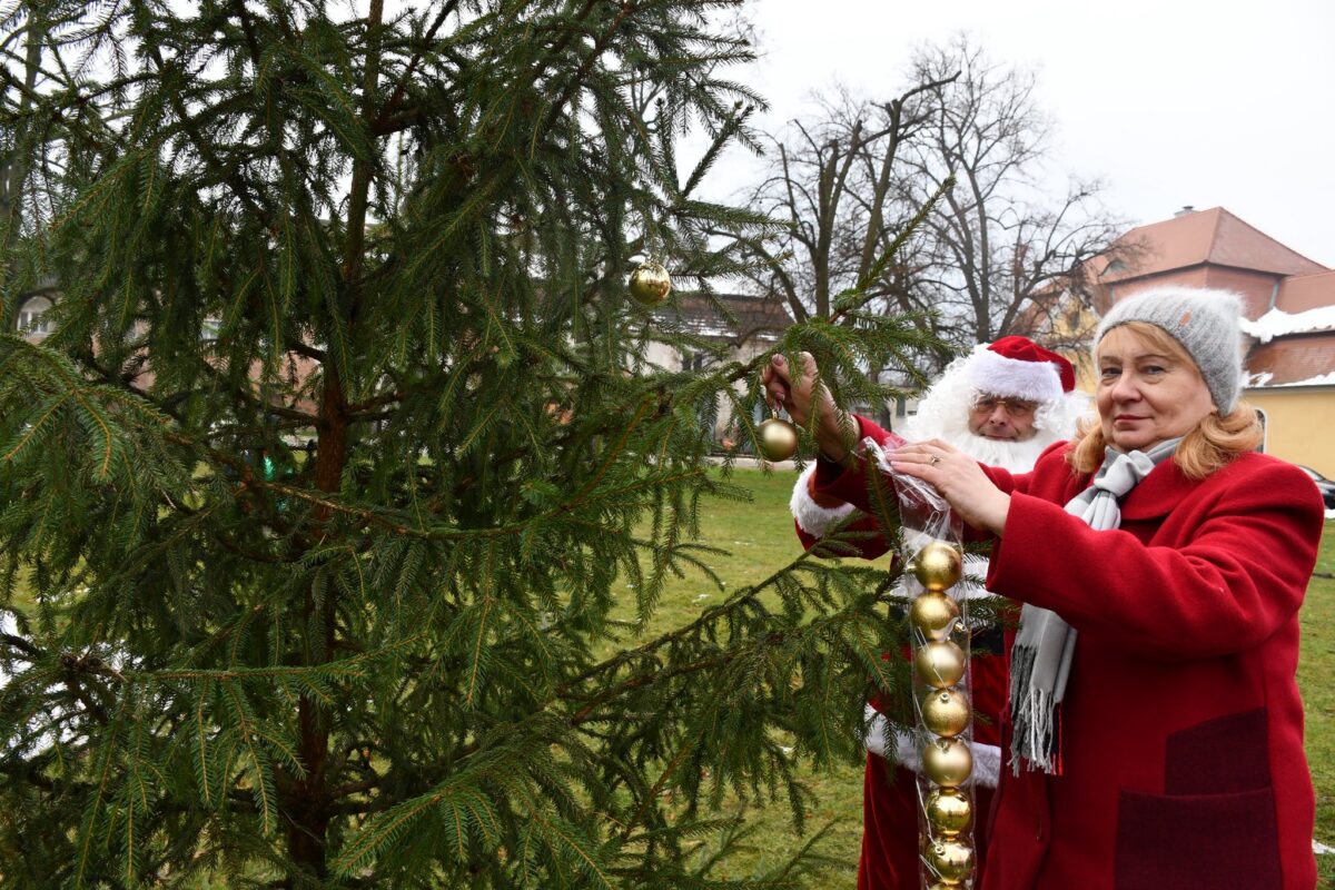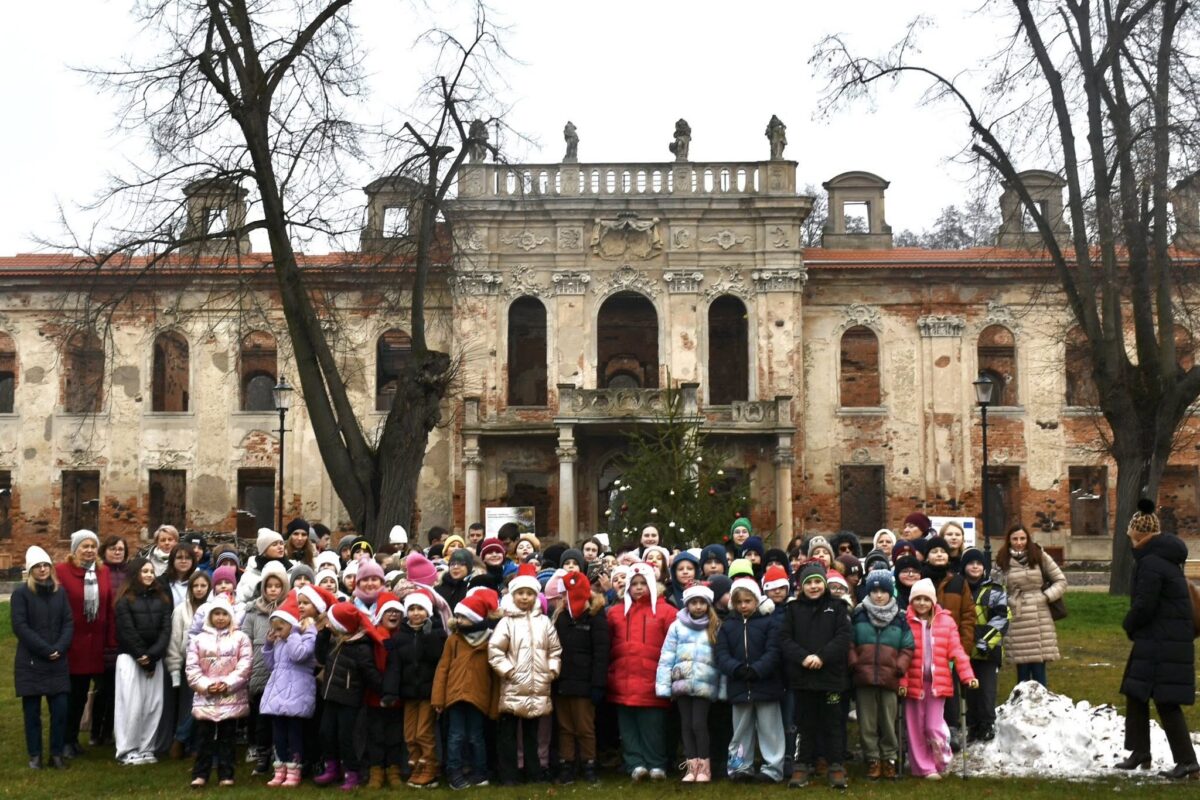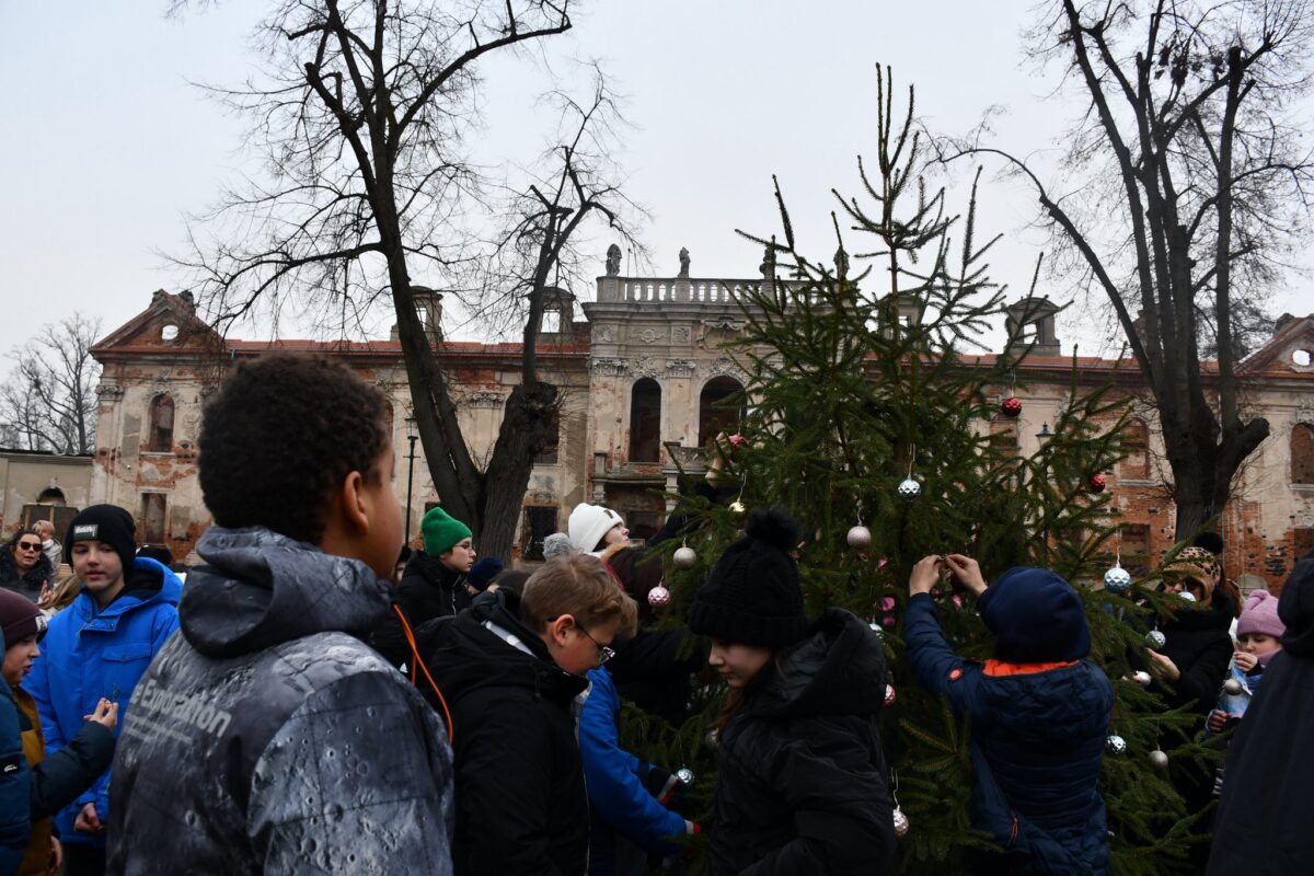 Po tym akcie uczniowie wraz z opiekunami przystąpili do wspólnego strojenia choinki, wprowadzając świąteczny nastrój na dziedzińcu Pałacu Goszcz.