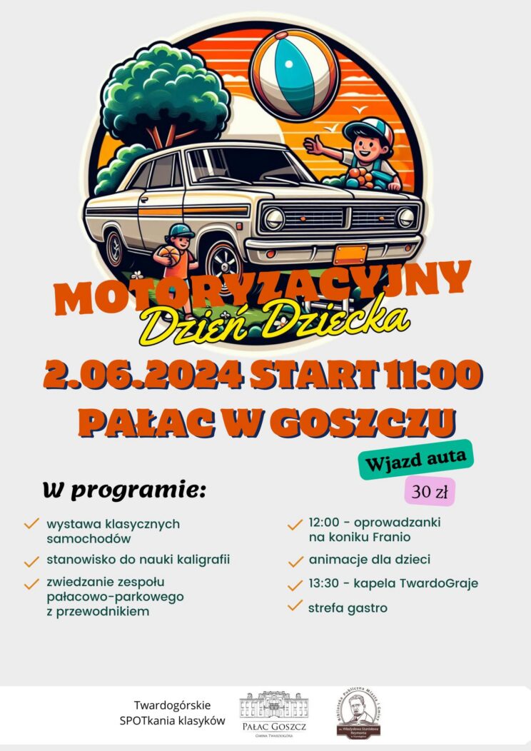 Zapraszamy na Motoryzacyjny Dzień Dziecka w Goszczu! Dołącz do nas 2 czerwca. Czeka na Was wiele atrakcji: stare samochody,animacje dla dzieci, muzyka na żywo od kapeli TwardoGraje, oprowadzankina koniku oraz zwiedzanie zespołu pałacowo-parkowego. Nie przegapcie tej wyjątkowej okazji do zabawy…