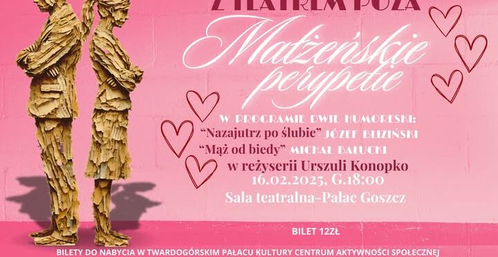16 lutego 2025 r. w sali teatralnej Pałacu Goszcz odbył się wyjątkowy, walentynkowy wieczór z Teatrem POZA. Publiczność mogła spędzić ten szczególny dzień w klimacie pełnym humoru, emocji i teatralnego uroku. W programie „Małżeńskich perypetii” zaprezentowano dwie przezabawne humoreski: „Nazajutrz…